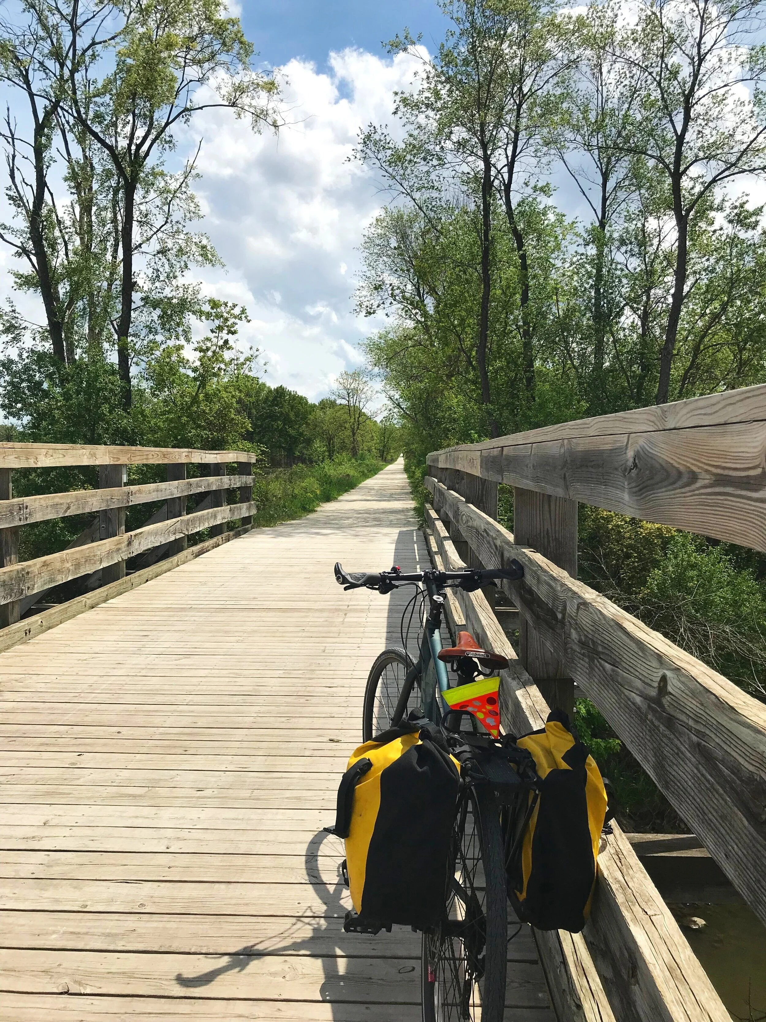 While the southern portions of the Prairie Trail (which extends north-ward where the Fox River Trail ends in Algonquin) are quite picturesque, with beautiful views and cooling breezes from the Fox River, this northern portion was linear, hot, fairly exposed, with lengthy sections where only the thinnest line of trees separates the trail from the nearby 2-lane highway. Nearing the northern end, riders pass through a charming town of Richmond with inviting bars and restaurants, but I elected to press on, determined to finally check out this overnight camping spot.