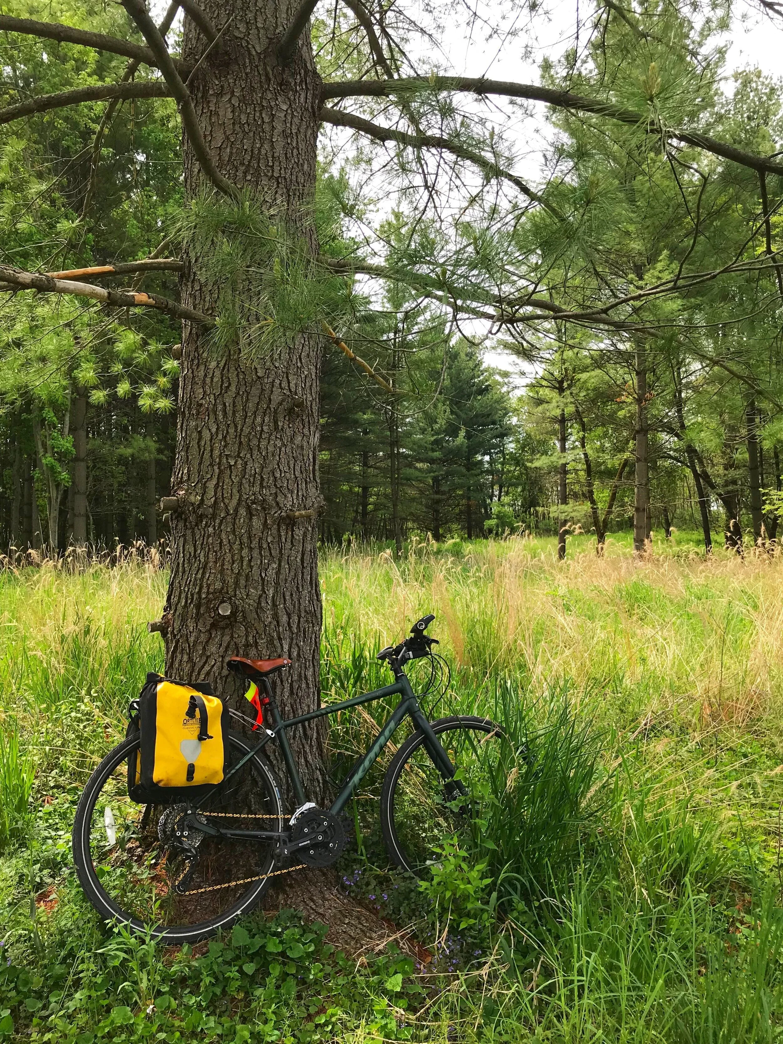I was most of the way back to the starting point, when I noticed a small side entrance with a picnic table and a sign designating it as Tamarack Core Area of McHenry County. Since the picnic table was in full sun, I continued down the side path, where I’m pretty sure I saw a man relieving himself, and I would have quickly escaped, except that in some distance, across a shaggy prairie hillside, I spied some evergreens. Unlike deciduous groves, which tend to be moist and overgrown, evergreens beckon with clear, dry, open spaces below their soaring, shading crowns. I got off my bike and scrambled with it through knee-deep prairie, and found exactly what I was looking for: the perfect tranquil and secluded spot to build a small fire in my portable woodstove, roast a plump sausage, brew my favorite strong tea, and kick back in my chair to watch the interplay of sun and shadows, listen to the birds, and inhale the scent of pine sap and dry needles.
